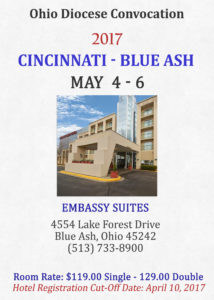 Ohio Diocese Convention 2017 Calendar Add to Calendar Add to Timely Calendar Add to Google Add to Outlook Add to Apple Calendar Add to other calendar Export to XML When: May 4, 2017 – May 6, 2017 all-day 2017-05-04T00:00:00+00:00 2017-05-07T00:00:00+00:00 Where: Embassy Suites 4554 Lake Forest Drive Blue Ash Ohio 45242 Contact: (513) 733-8900